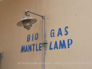 The image on the left/above shows a lamp in which the biogas burns on the surface of a mantle of inflammable material. The result is that the mantle becomes very hot and emits a bright white light almost as good as an electric light bulb.