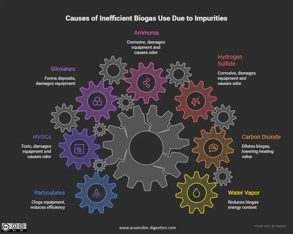Raw biogas has a number of components that can cause problems if it is used without being treated. Methane (CH4), which is the part of biogas that produces energy (usually 50-70% of biogas), is what we want. However, the rest of it is made up of compounds that can cause significant problems with equipment and efficiency. Knowing what these contaminants are is the first step in purifying biogas effectively.